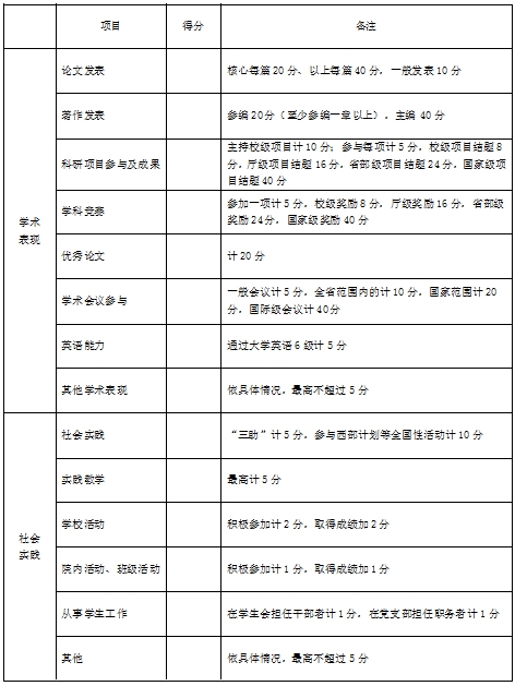 5.研究生三年级员工学业奖学金评定条件和办法:学业成绩合格,符合学术条件;学术表现分数(详见附表一)占总分的80%,界定范围为1—6学期(已申请过的学术方面成果不再计入);社会实践分数(详见附表一)占总分的20%,界定范围为4—6学期。