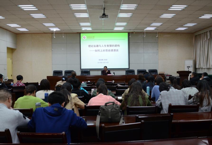 赖雄麟教授从我们为什么需要思想政治教育、思想政治教育的性质、如何上好思想政治教育三个方面进行了精彩地讲解并与与会师生进行了互动交流。