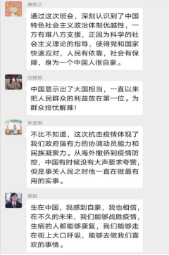 最后,赵剑波老师总结本次“云”班会,讲解新冠肺炎疫情下体现出中国特色社会主义制度的优越性。中国共产党领导中华民族在社会主义制度下从战乱中萌发壮大,具有中国特色的社会主义管理制度使得中国人民开始卓立潮头,社会主义制度的巨大优势就是能够集中力量办大事,这在新中国成立70年、改革开放40年来的实践和遭遇重大事件中反复得到印证,所以我们坚信我们的国家一定有能力取得疫情防控阻击战的最终胜利!