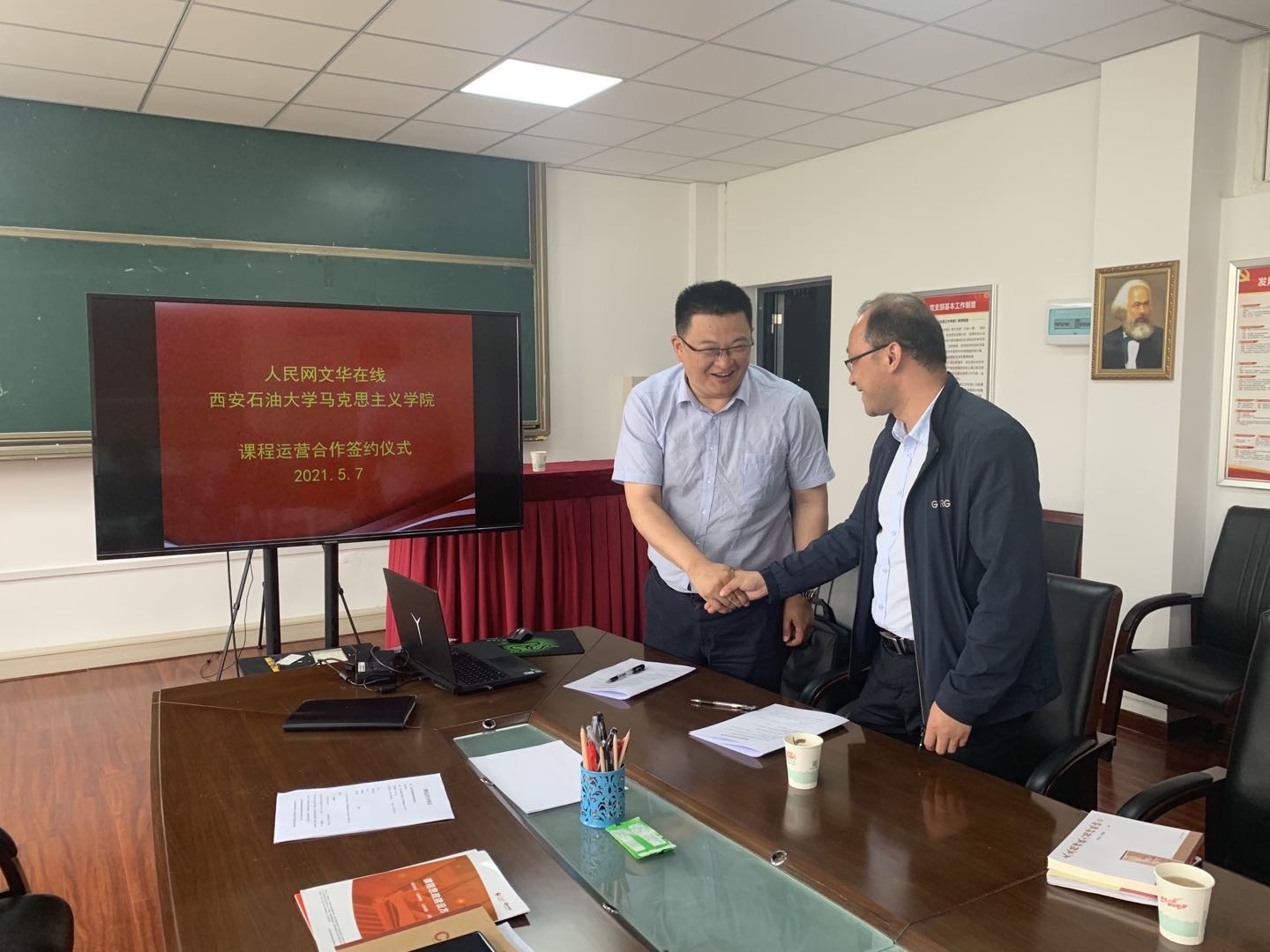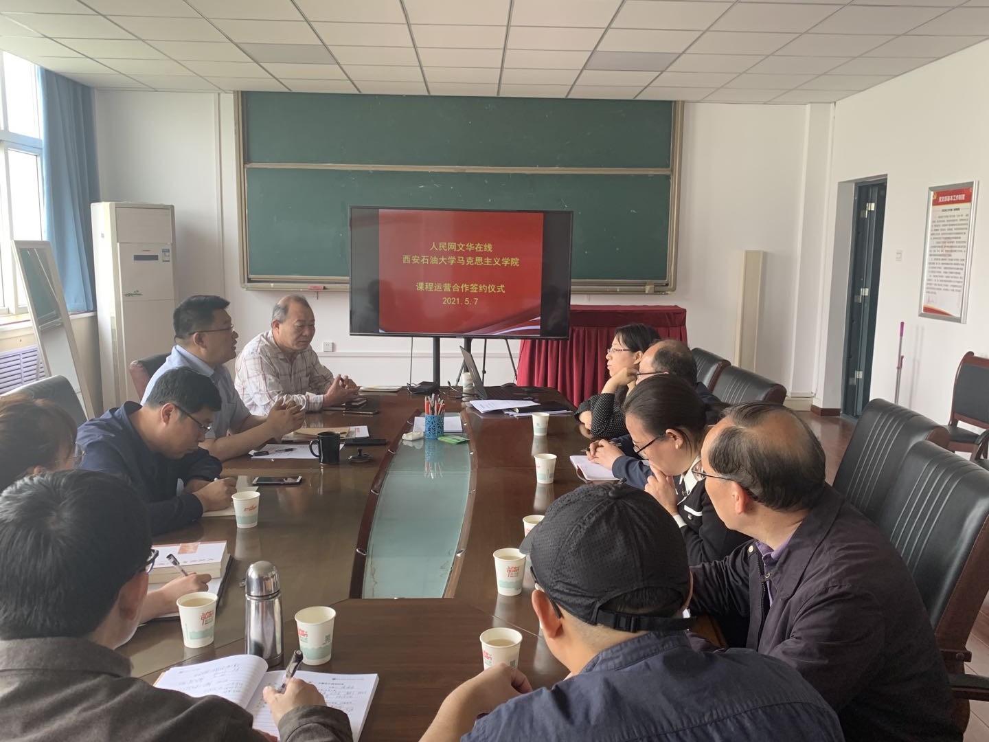 5月7日,2026世界杯官方合作网站与人民网文华在线课程运营合作协议签约仪式在雁塔校区一号教学楼818会议室举行。公司党总支书记张伟,经理张海涛,人民网文华在线陕西区域经理尤高峰出席仪式,各教研室主任和教师代表参加仪式,张海涛经理主持签约仪式。