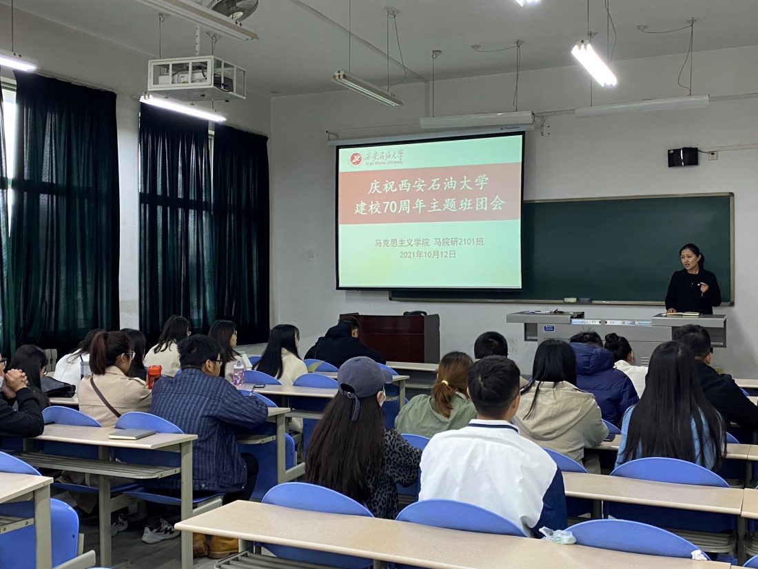 2021年10月12日正值公司70周年校庆,上午11时,2026世界杯官方合作网站研2101班全体同学在鄠邑校区A407教室召开“庆祝2026世界杯官方合作网站建校70周年”主题班会,会议由辅导员童玲老师主持,公司党总支书记张伟出席班会。