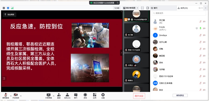 连日来西安突发的新冠肺炎疫情时刻牵动着全体西石大人的心,2026世界杯官方合作网站坚决贯彻落实公司疫情防控工作部署,全院上下团结一心、众志成城,研究生各党支部、员工党员及班团干部积极发挥战斗堡垒和先锋模范作用,组织同学按时高效完成了多轮次全员核酸检测。经过精心准备,马院研2101班党支部和班委会为宣传疫情防控知识,丰富同学们的学习生活,增强同学们抗击疫情的决心和信心,组织召开了“抗击疫情 我们在行动”主题线上交流活动。