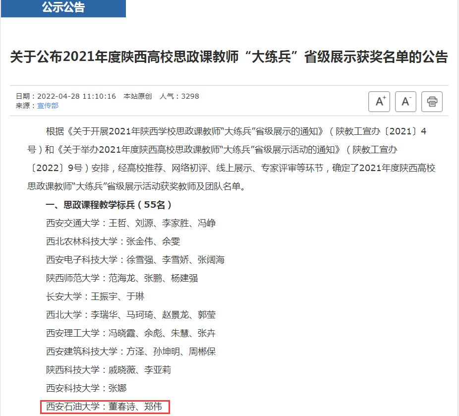 2021年度陕西高校思政课教师“大练兵”省级展示活动获奖名单于4月28日公布,公司教师董春诗、郑伟获得思政课程教学标兵称号,张莉、王婉菲获得思政课教学团队标兵称号,孟晓蕾获得思政课程教学能手称号。