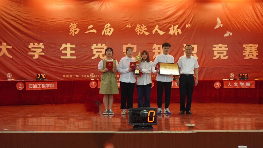 决赛现场气氛紧张激烈,参赛选手们情绪高昂。在必答题环节,选手们冷静思考、沉着应答;在抢答题环节,选手们全神贯注、反应迅速;在风险题环节,选手们认真思索、谨慎作答,将比赛气氛推向高潮。比赛现场,参赛选手沉着冷静、机智应战,场上比分你追我赶,活动气氛紧张活跃,极大激发了选手们的集体荣誉感。本次竞赛为师生呈现了一场精彩纷呈的知识盛宴,充分展现了西石大学子们良好的理论知识素养和过硬的思想政治素质。经过激烈的角逐,外国语公司荣获一等奖,电子工程公司、计算机公司荣获二等奖,石油工程公司、地球科学与工程公司、人文公司荣获三等奖。与会领导为获奖代表队颁奖。