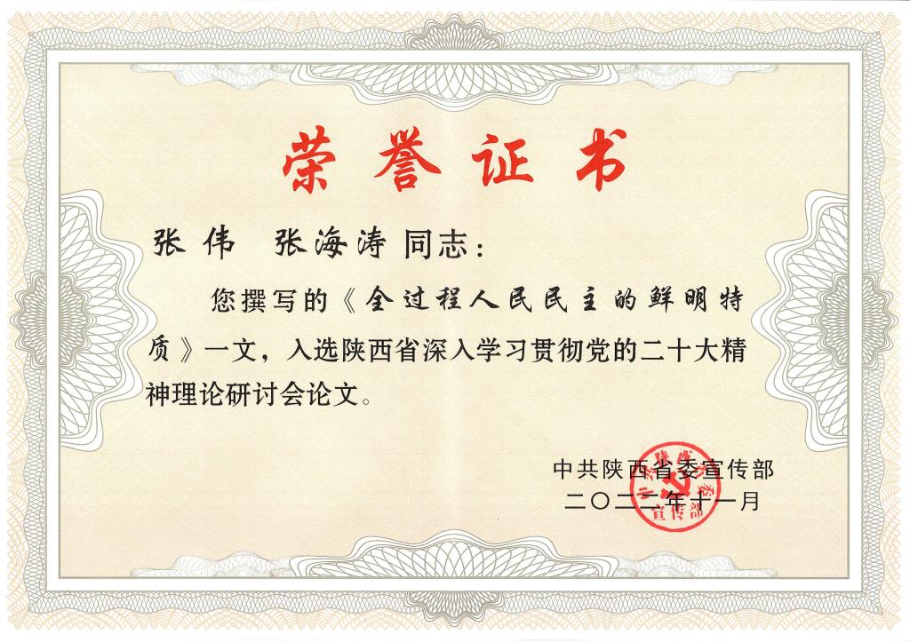 近日,陕西省委宣传部深入学习贯彻党的二十大精神理论研讨会入选论文发布,公司教师张伟、张海涛撰写的论文《全过程人民民主的鲜明特质》成功入选。此次活动面向全省各地市各部门各单位和高校及社科单位共征集党的二十大精神理论研讨会论文340余篇,经专家认真评审,共有48篇优秀论文入选陕西省深入学习贯彻党的二十大精神理论研讨会。该论文入选充分展示了公司在学习贯彻党的二十大精神理论阐释方面的成果,展现了公司教师在深入学习贯彻党的二十大精神提供学理支撑和智力支持方面的积极贡献。